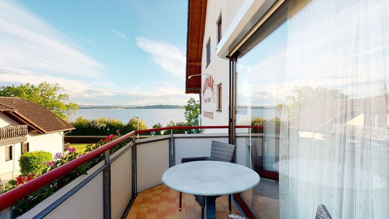 Unser beliebtes Appartement „Hegau“ liegt mit seinen 34 m² im Zwischengeschoß und bietet Ihnen mit dem überdachten Balkon eine herrliche Seesicht. Sie finden hier eine zum See ausgerichtete Raumaufteilung mit Doppelbett, Sitz- und Essbereich sowie einer ausgestatteten Küche. Der Balkon ist mit einer Sonnenmarkise ausgestattet.