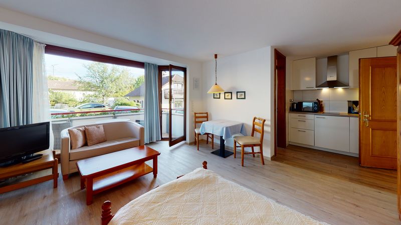 Unser beliebtes Appartement „Säntis“ liegt mit seinen 34 m² im Obergeschoß und bietet Ihnen über den überdachten Balkon eine herrliche Seesicht. Der Raum ist ebenfalls zum See ausgerichtet und verfügt über ein Doppelbett, Sitz- und Essbereich sowie einer ausgestatteten Küche. Auf dem Balkon finden Sie eine Sonnenmarkise.